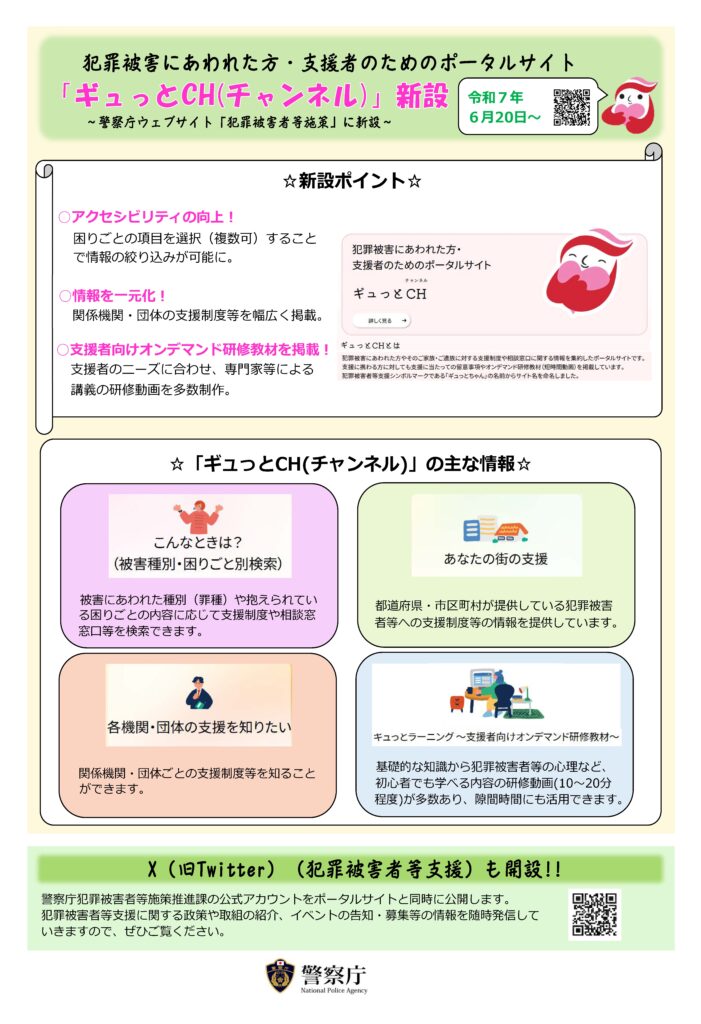 【情報・警察庁犯罪被害者等施策推進課】犯罪被害にあわれた方・支援者のためのポータルサイト「ギュっとCH(チャンネル)」の開設について