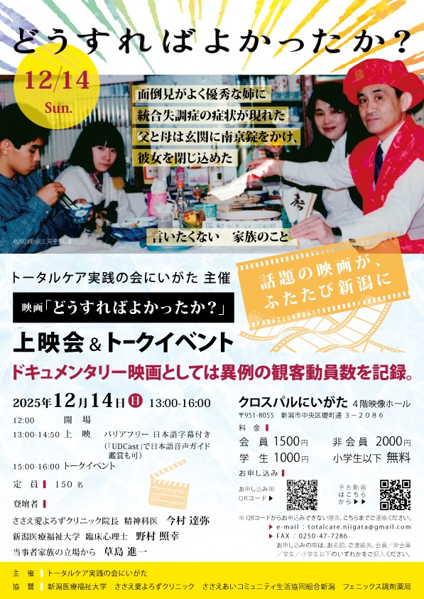 | 詳細 | 主催トータルケア実践の会にいがた 映画「どうすればよかったか?」ドキュメンタリー監督の藤野知明が、統合失調症の症状が現れた姉と、彼女を精神科の受診から遠ざけた両親の姿を20年にわたって自ら記録したドキュメンタリー。 面倒見がよく優秀な8歳上の姉。両親の影響から医師を目指して医学部に進学した彼女が、ある日突然、事実とは思えないことを叫びだした。統合失調症が疑われたが、医師で研究者でもある父と母は病気だと認めず、精神科の受診から彼女を遠ざける。その判断に疑問を感じた藤野監督は両親を説得するものの解決には至らず、わだかまりを抱えたまま実家を離れる。 姉の発症から18年後、映像制作を学んだ藤野監督は帰省するたびに家族の様子を記録するように。一家全員での外出や食卓の風景にカメラを向けながら両親と対話を重ね、姉に声をかけ続けるが、状況はさらに悪化。ついに両親は玄関に鎖と南京錠をかけて姉を閉じ込めるようになってしまう。 20年にわたってカメラを通して家族との対話を重ね、社会から隔たれた家の中と姉の姿を記録した本作。 参加費トータルケア実践の会会員 1,500円 詳細・申込以下のチラシをご参照ください
